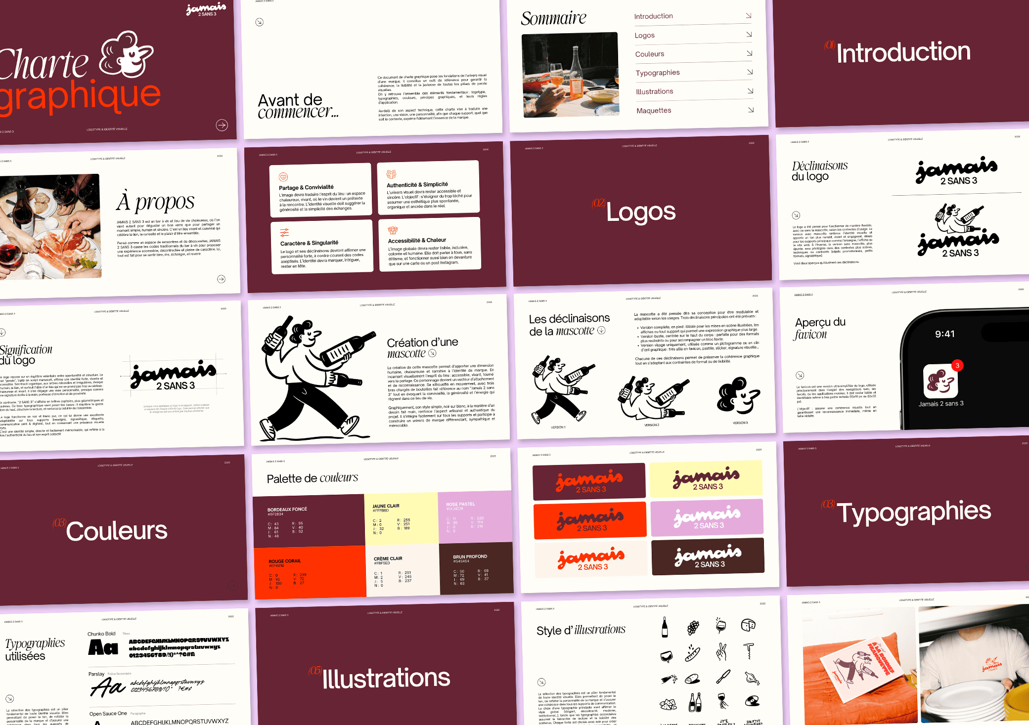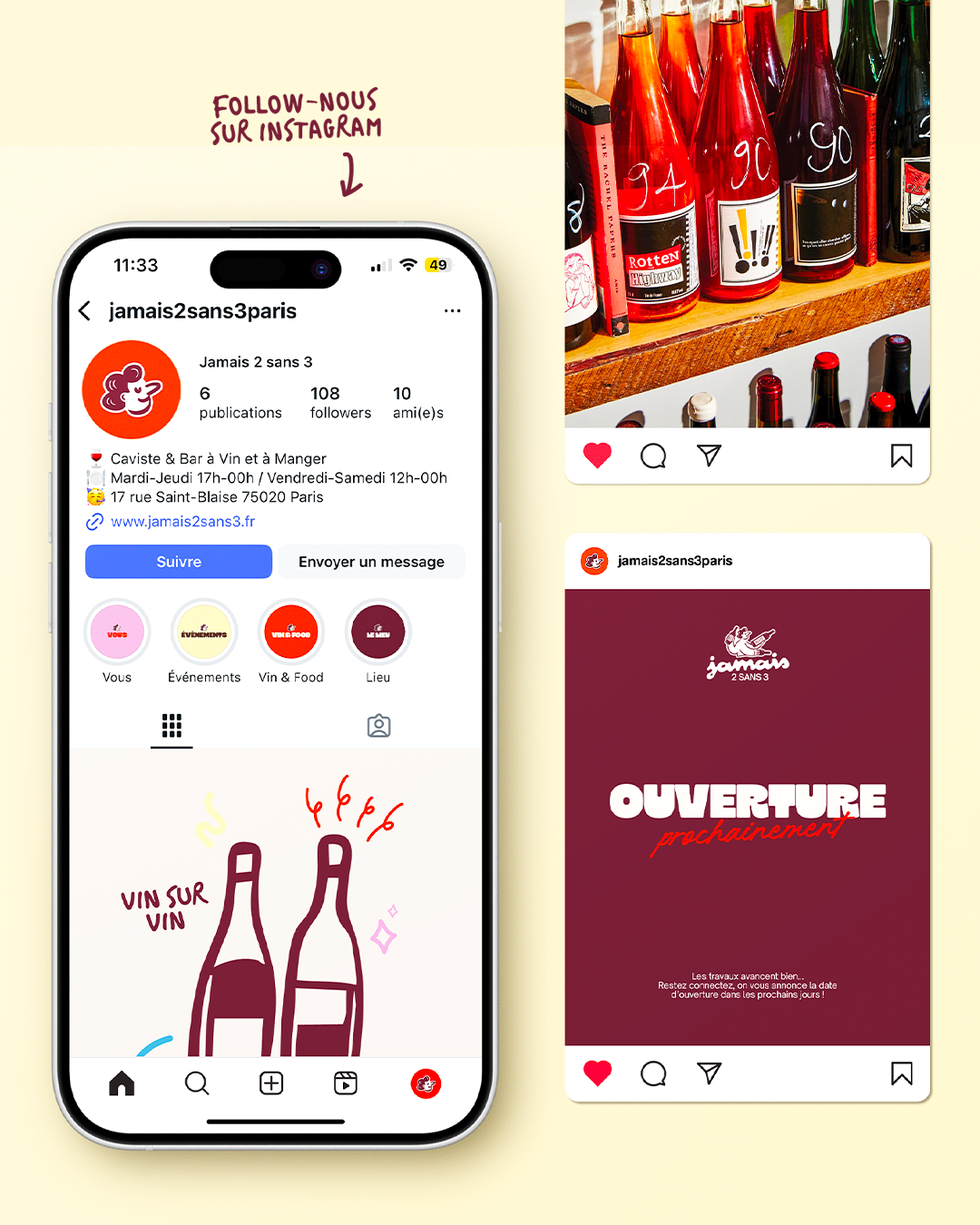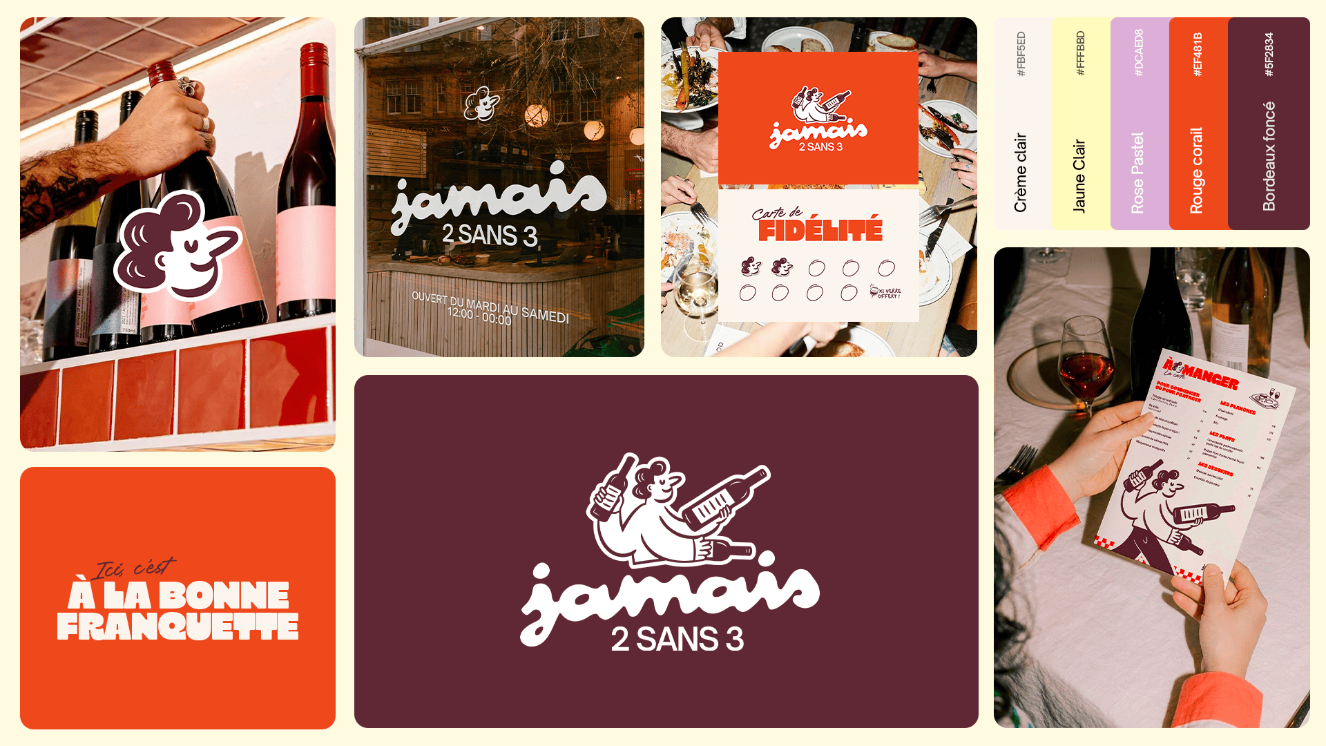 Jamais 2 sans 3 est une cave à vin et lieu de vie créé par Yvan. Il m’a confié la conception complète de son identité visuelle afin d’installer une image forte avant l’ouverture.
